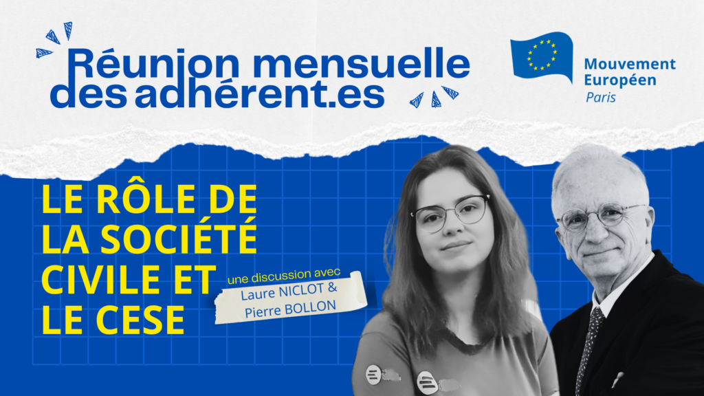 Les adhérent.e.s attendant le démarrage de la séance. Le 9 mars 2026, le Mouvement Européen Paris a réuni ses adhérents pour échanger sur le rôle et le fonctionnement du Conseil Économique et Social Européen (CESE). Laure Niclot, membre du CESE et vice-présidente du Mouvement Européen France, ainsi que Pierre Bollon, membre suppléant du CESE, après […]