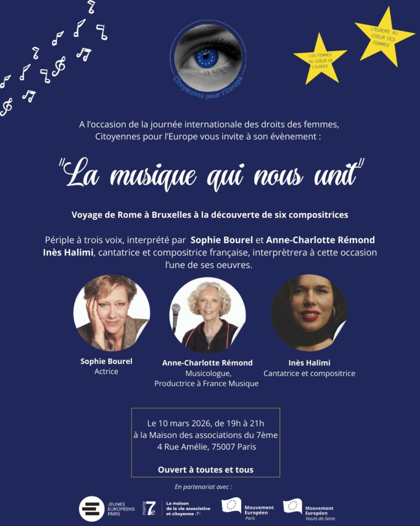 À l’occasion de la Journée internationale des droits des femmes, Les Citoyennes pour l’Europe en partenariat les Jeunes Européens-Paris, la Maison de la Vie Associative et Citoyenne (MVAC) du 7e, le Mouvement Européen Paris et le Mouvement Européen Hauts-de-Seine, préparent une belle soirée placée sous le signe de l’Europe et de la création musicale !